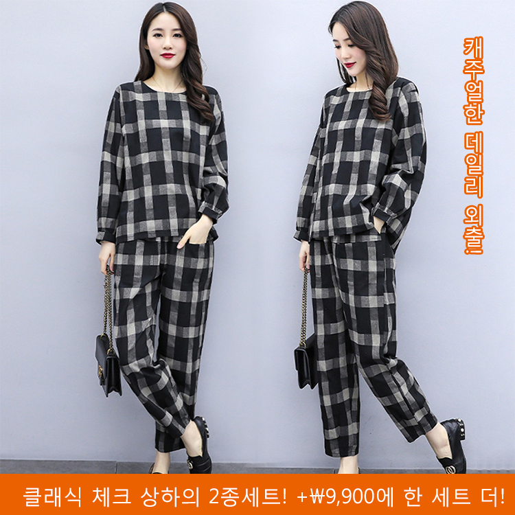 클래식한 체크 패턴 디자인, 친피부 소재로 부드럽게 감싸주는 센스, 캐주얼한 데일리 외출이 되는 세련된 핏감, 상하의 2종세트₩9,900에 한 세트 더!